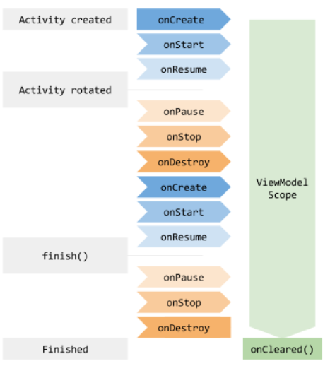 이러한 문제를 해결하기 위해서 나온 것이 바로 ViewModel 이다. ViewModel은 Activity의 onDestroy가 호출되더라도 소멸되지 않는다. Activity내에서 finish()를 직접 호출하거나 사용자가 액티비티를 닫을 때(백키를 누르거나 히스토리에서 제거할때) 소멸된다. Activity가 재성성 되었을 때도 유지하고 싶은 데이터는 ViewModel에 저장하면 된다. 그래서 ViewModel에는 주로 UI와 연관된 데이터를 주로 저장한다.