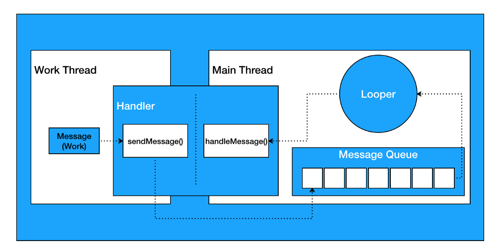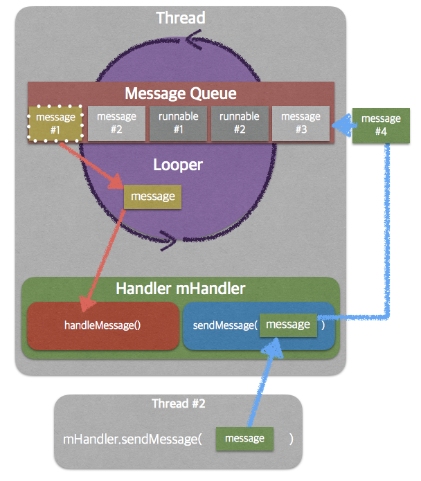 - 각 쓰레드의 Looper 내부에는 MessageQueue 라는 것이 존재하는데, 여기에는 해당 쓰레드가 처리해야 할 동작들이 '메세지' 라는 형태로 하나씩 쌓이게 된다. (큐 라는 이름에서 알 수 있듯 당연히 FIFO 방식이다)