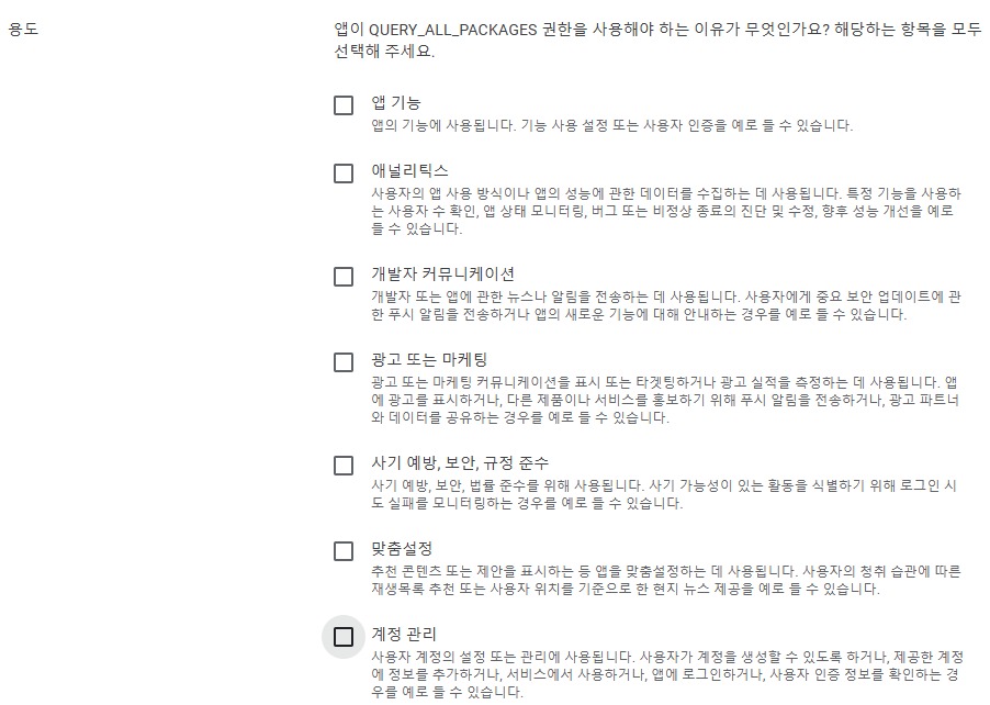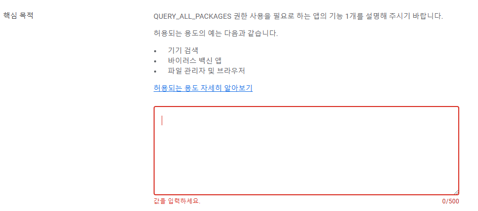 일반적인 권한들과는 다르게 민감한 정보에 접근하는 권한 및 API(링크)는 앱을 출시할 때 사용 허가를 받아야 출시가 가능하다. QUERY_ALL_PACKAGES 또한 허가를 받아야 출시가 가능하다.