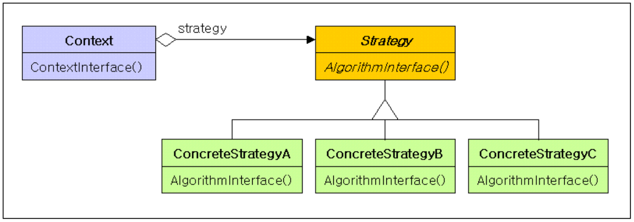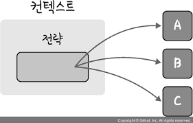 전략 패턴(strategy pattern)정책 패턴(policy pattern)이라고도 하며, 객체의 행위를 바꾸고 싶은 경우 '직접' 수정하지 않고 전략이라고 부르는 '캡슐화한 알고리즘'을 컨텍스트안으로 바꿔주면서 상호 교체가 가능하게 만드는 패턴이다.