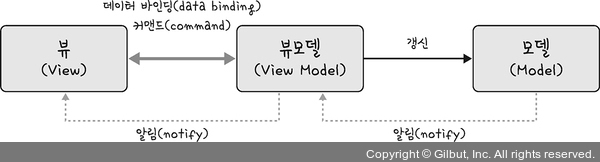 데이터 바인딩 : 화면에 보이는 데이터와 웹 브라우저의 메모리 데이터를 일치시키는 기법으로, 뷰모델을 변경하면 뷰가 변경된다