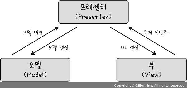 MVP 패턴은 MVP 패턴으로부터 파생되었으며  MVC에서 C에 대항하는 컨트롤러가 프레텐터(presenter)로 교체된 패턴입니다.
