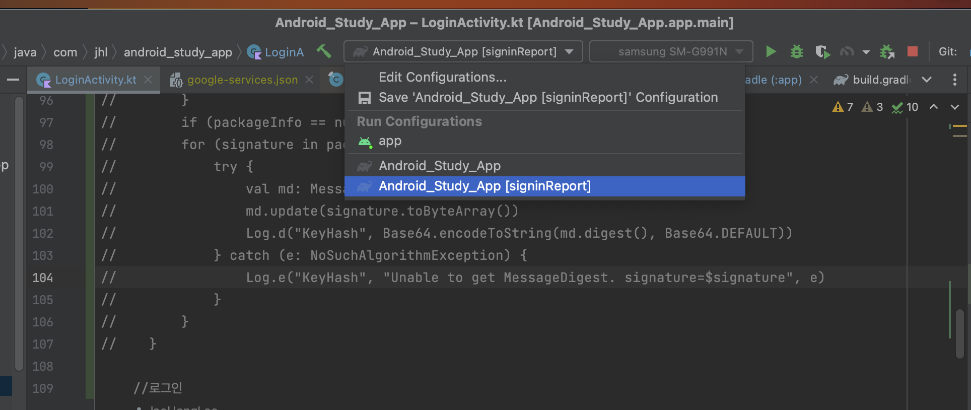 dependencies { ... //----------- firebase 부분 ------------ implementation platform('com.google.firebase:firebase-bom:32.0.0') implementation 'com.google.firebase:firebase-analytics-ktx' //----------- 구글 로그인 부분 ------------ implementation 'com.google.firebase:firebase-auth-ktx' implementation 'com.google.android.gms:play-services-auth:20.5.0' } apply plugin: 'com.google.gms.google-services'b) LoginActivity.kt