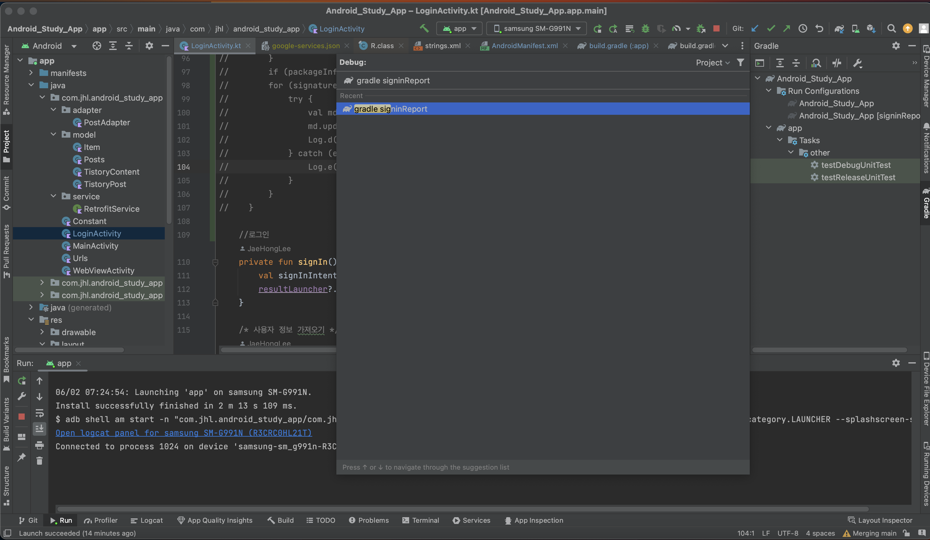 Android Studio에서 SHA-1 디지털 지문 찾는 방법 : 오른쪽 gradle 에서 Gradle 아래 & Android_Study_App 위에 맨 왼쪽 클릭해서 'gradle signinReport' 누르고 app대신 실행시키면 나온다.