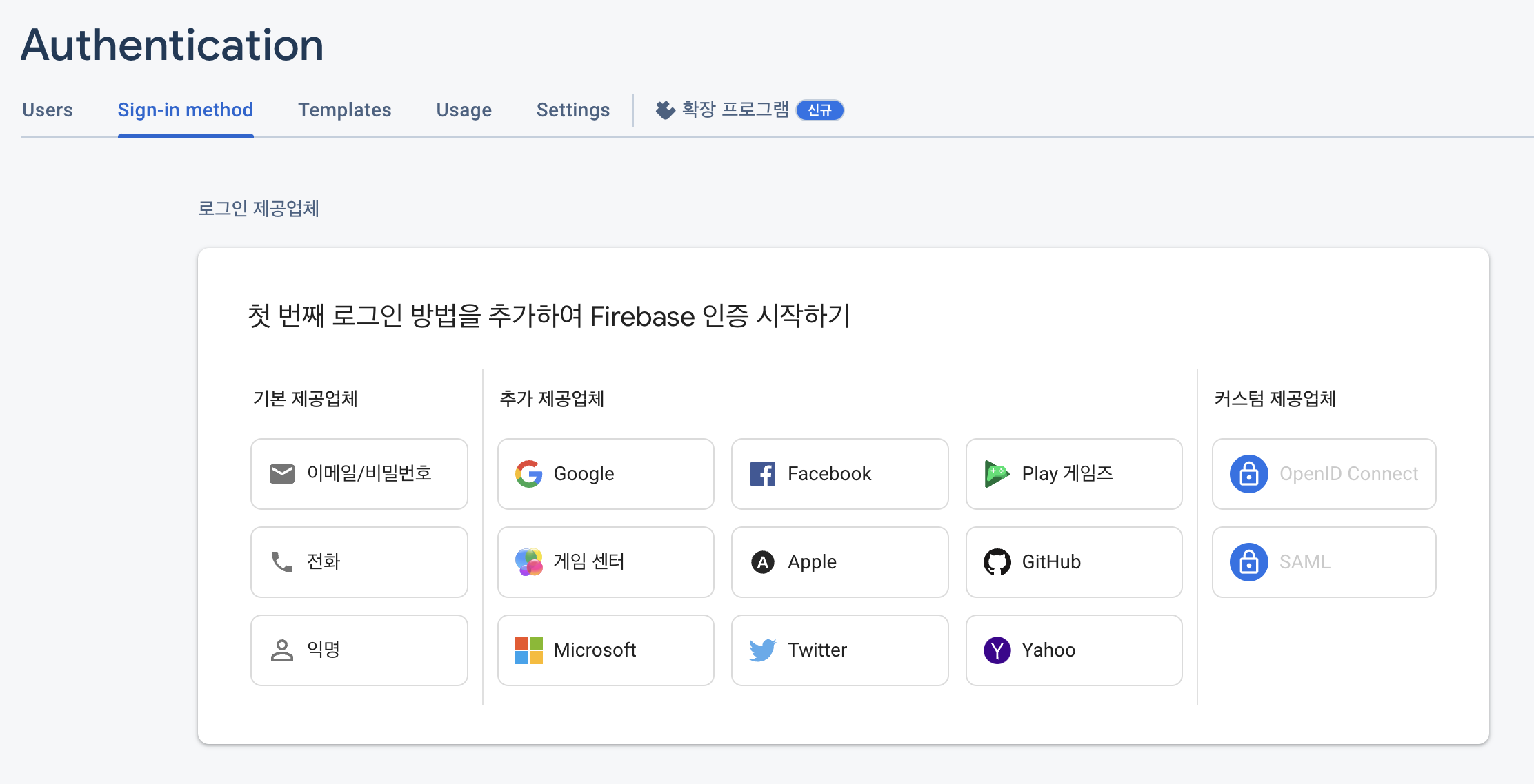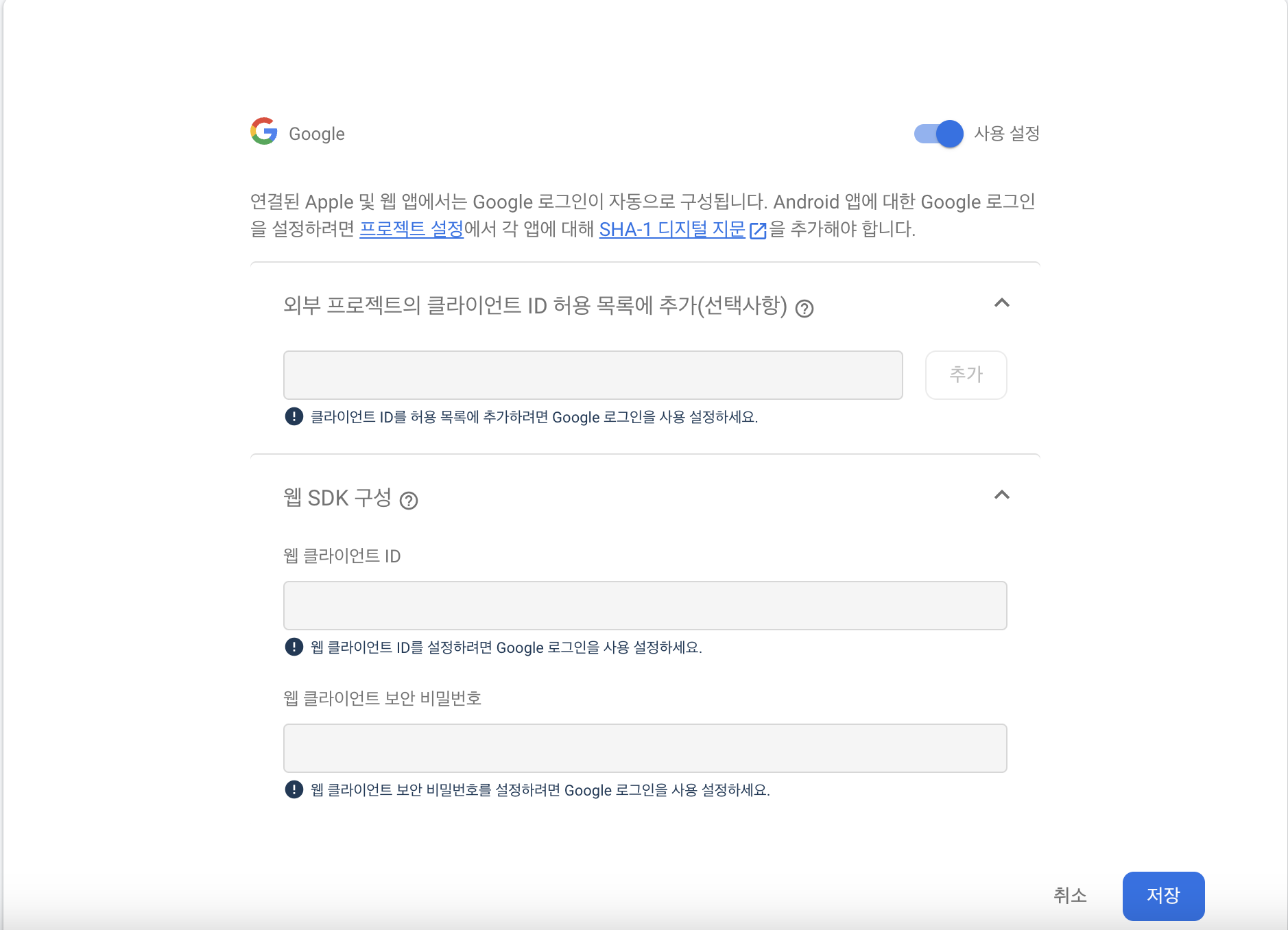 b). 그 다음 위에 'Sign-in method' 칸 -> '추가 제공업체' -> 'Google' 클릭