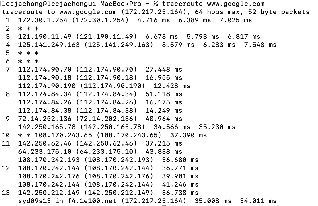 - 목적지 노드까지 네트워크 경로를 확인할 때 사용하는 명령어입니다.