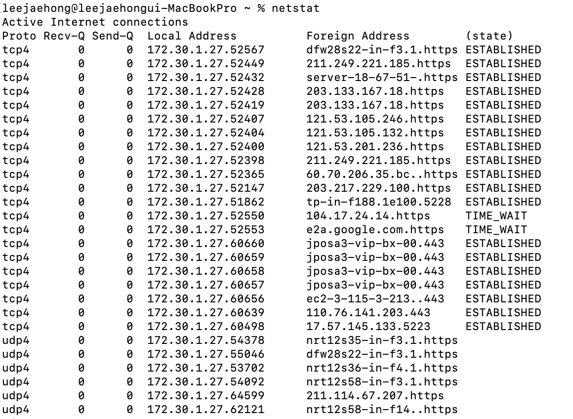 - netstat 명령어는 접속되어 있는 서비스들의 네트워크 상태를 표시하는 데 사용된다.