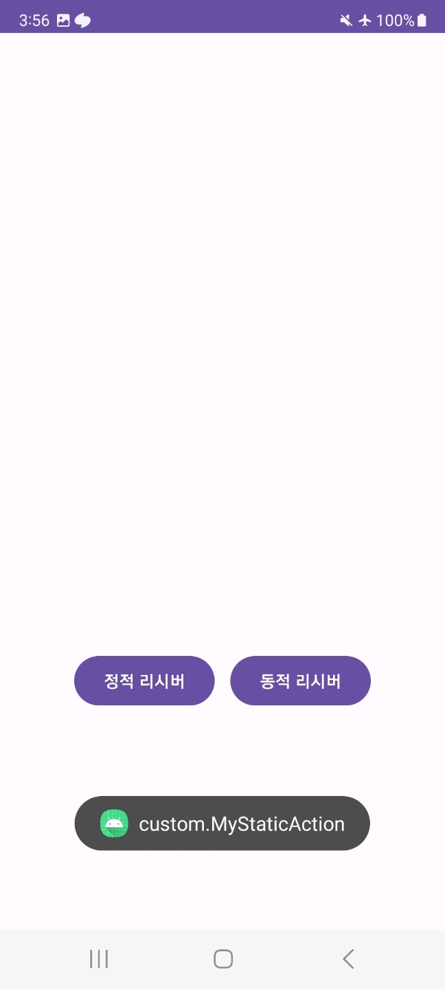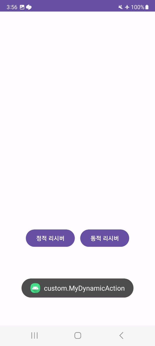 dynamicReceiverBtn.setOnClickListener{ val intent = Intent("custom.MyDynamicAction") sendBroadcast(intent) }전체 예제 : 정적 + 동적 리시버