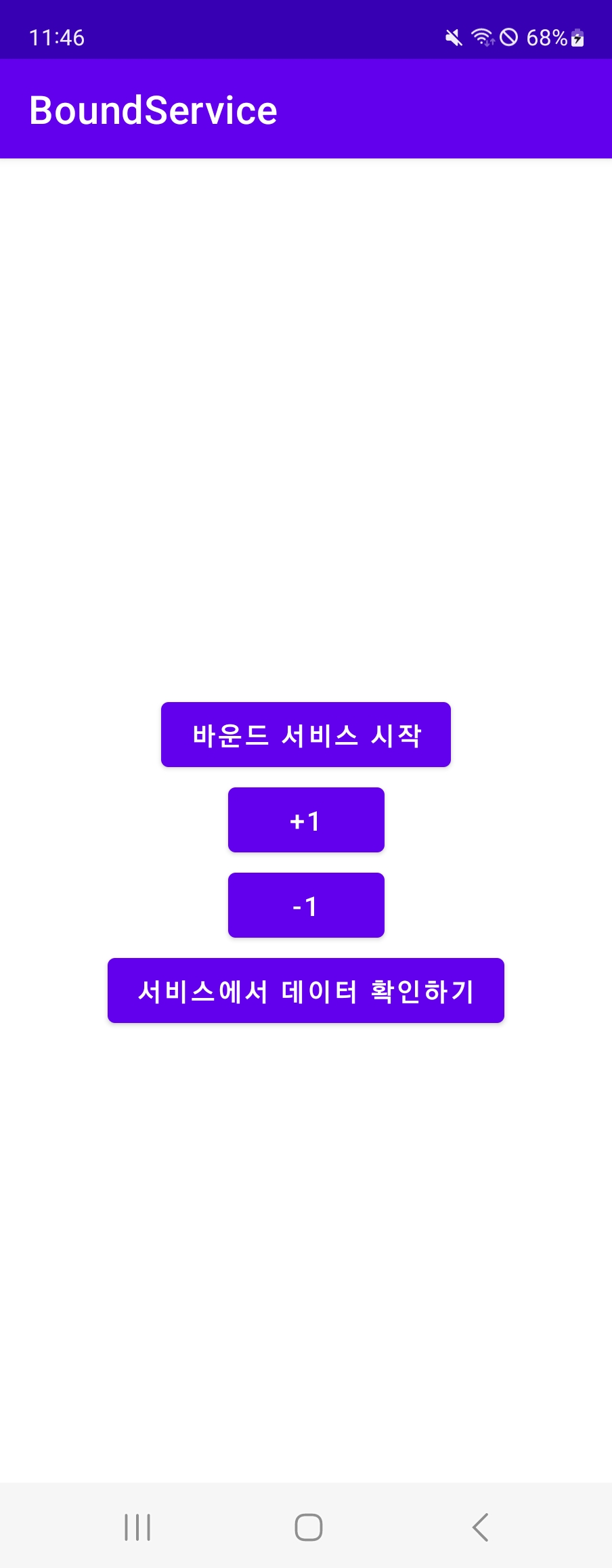 class MainActivity : AppCompatActivity() { var myService: MyService? = null var isService = false // 서비스 중인 확인용 override fun onCreate(savedInstanceState: Bundle?) { super.onCreate(savedInstanceState) setContentView(R.layout.activity_main) val button1 = findViewById<Button>(R.id.button1) val button2 = findViewById<Button>(R.id.button2) val plusBtn = findViewById<Button>(R.id.plusBtn) val minusBtn = findViewById<Button>(R.id.minusBtn) button1.setOnClickListener { val intent = Intent(this@MainActivity, MyService::class.java) bindService(intent, conn, Context.BIND_AUTO_CREATE) } button2.setOnClickListener{ if (!isService) { Toast.makeText(applicationContext, "서비스중이 아닙니다, 데이터받을수 없음", Toast.LENGTH_LONG).show() return@setOnClickListener } val num = myService!!.getNumber() //서비스쪽 메소드로 값 전달 받아 호출 Toast.makeText(applicationContext, "받아온 데이터 : $num", Toast.LENGTH_LONG).show() } plusBtn.setOnClickListener{ myService?.plusOne() } minusBtn.setOnClickListener{ myService?.minusOne() } } var conn: ServiceConnection = object : ServiceConnection { // 서비스와 연결되었을 때 호출되는 메서드 override fun onServiceConnected(name: ComponentName, service: IBinder) { val localBinder = service as LocalBinder // 서비스 객체를 전역변수로 저장 myService = localBinder.service isService = true } // 서비스와 연결이 끊겼을 때 호출되는 메서드 override fun onServiceDisconnected(name: ComponentName) { isService = false Toast.makeText(applicationContext, "서비스 연결 해제", Toast.LENGTH_LONG).show() } } }3. activity_main.xml